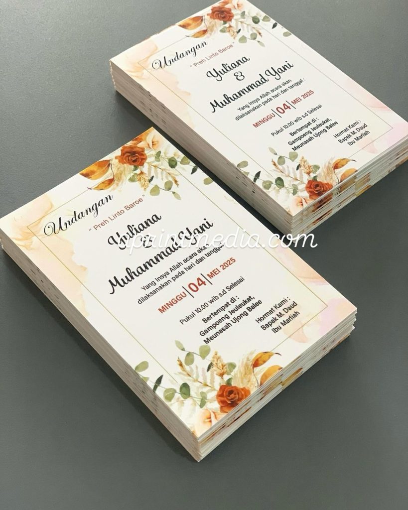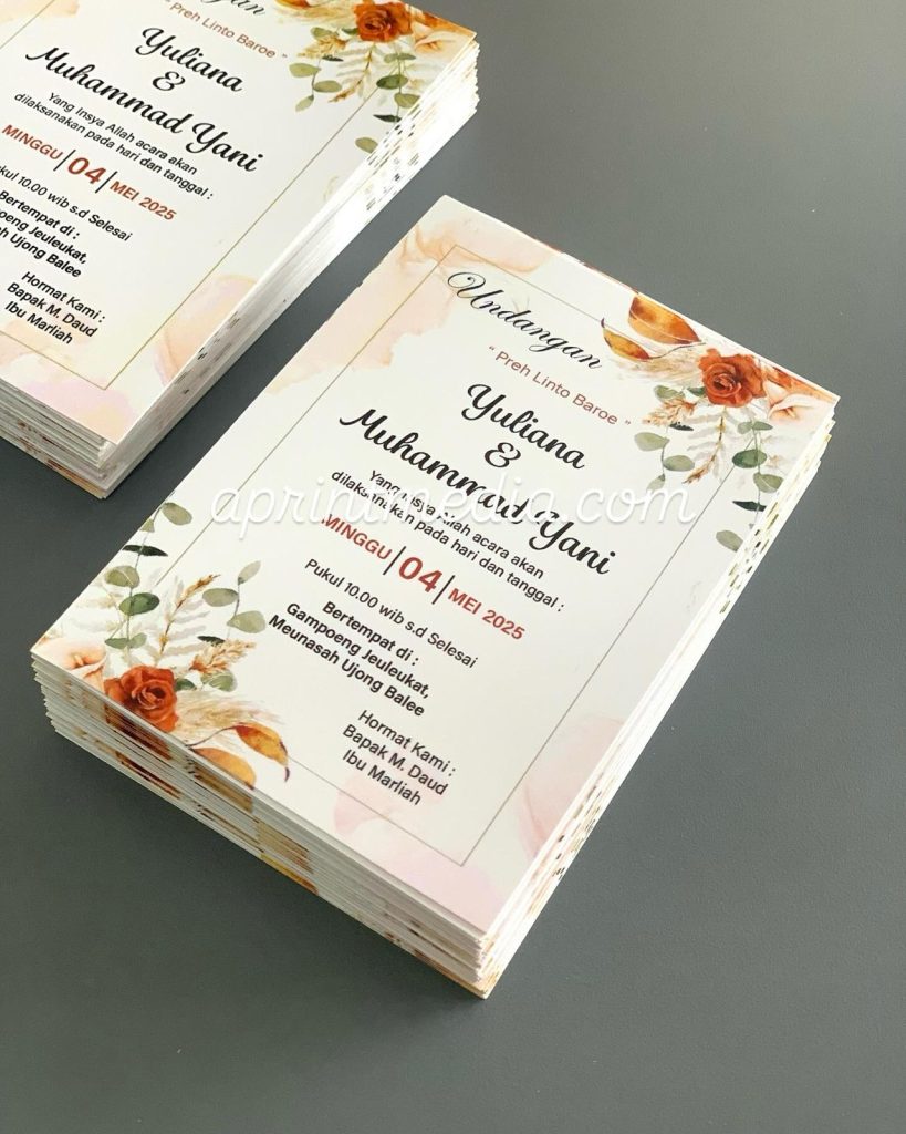 Undangan Kartu kertas art paper tebal, dengan ukuran 11×7.5 cm, ukuran pas tidak kecil dan tidak terlalu besar, harga hanya 1000 rupiah perlembar, minimal cetak 100 lembar, gratis ongkir untuk seluruh wilayah aceh. Silahkan order di aprintmedia.com