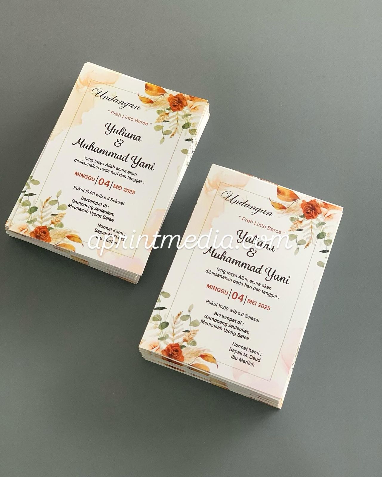 Undangan Kartu kertas art paper tebal, dengan ukuran 11×7.5 cm, ukuran pas tidak kecil dan tidak terlalu besar, harga hanya 1000 rupiah perlembar, minimal cetak 100 lembar, gratis ongkir untuk seluruh wilayah aceh. Silahkan order di aprintmedia.com